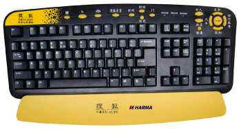 下面再来说说这款键盘的其他情况,它的整个键盘为黑色基调,最上方是一排黄色多功能快捷键配上黄色的多功能快捷键。为了使用更舒适,它还带有一个手托板,价格为120元。至于手感,笔者感觉还算可以,感兴趣的朋友可以到硅谷A131#去看看,电话:82852541。
